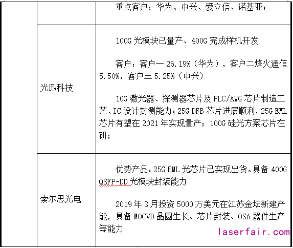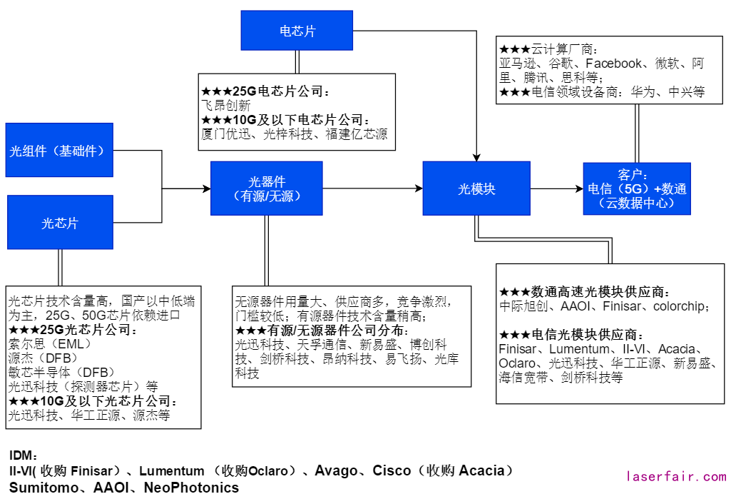 光模塊產(chǎn)業(yè)鏈遵循芯片(襯底-外延片-芯片)—>器件—>模塊—>客戶流程。