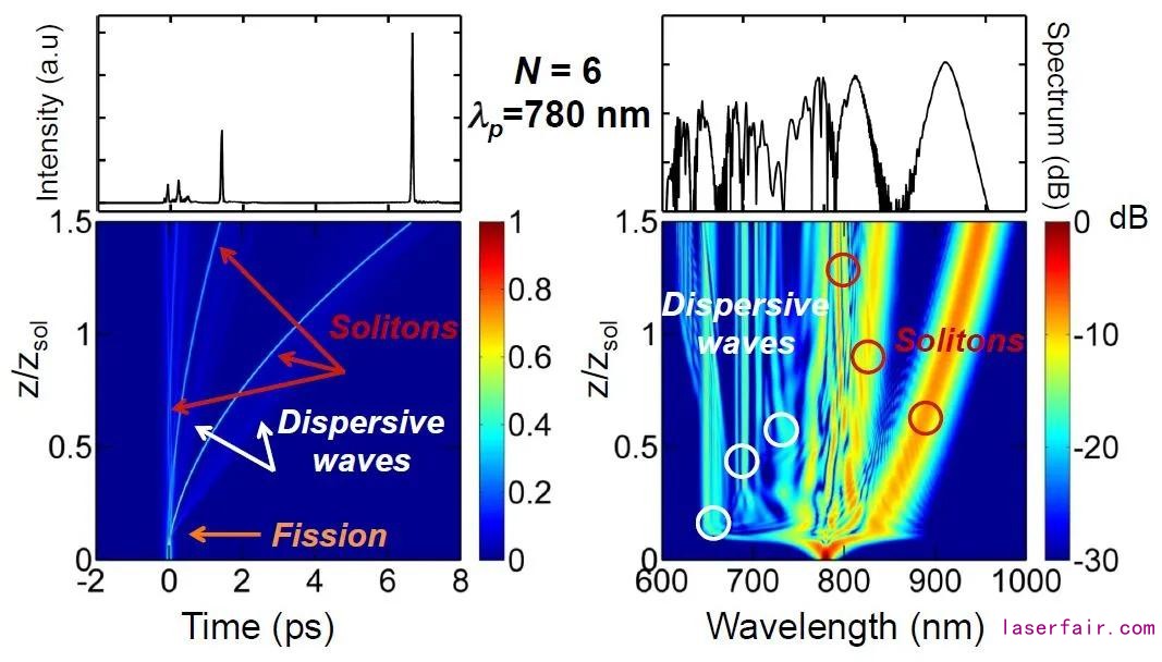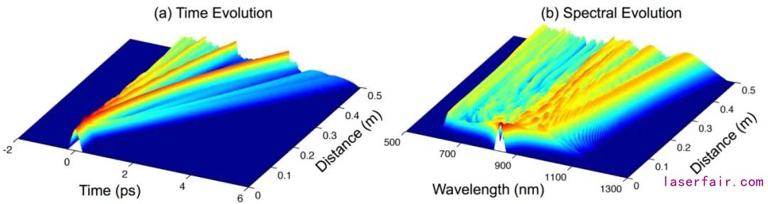 對于每個新形成的孤子,高階色散使能量向短波長傳遞,非彈性光散射效應(yīng)使光譜連續(xù)向長波長頻移。完全理解這兩個過程中的數(shù)學(xué)細(xì)節(jié)非常復(fù)雜,但通過模擬可形象地展示脈沖在時域和頻域的演變過程。