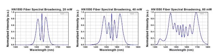 盡管實(shí)驗(yàn)裝置簡單,但是超連續(xù)產(chǎn)生的物理過程非常復(fù)雜。一般而言,激光功率越高,誘導(dǎo)的材料非線性極化越強(qiáng),超連續(xù)譜的帶寬越大,所以皮秒和飛秒激光因?yàn)榫哂懈叻逯倒β食1挥米鞣N子源。下面三圖比較了不同功率的飛秒激光通過Thorlabs高非線性光纖展寬的模擬結(jié)果。因?yàn)楦叻蔷€性光纖的模場較小,所以熔接過程更為復(fù)雜,Thorlabs提供專業(yè)光纖熔接服務(wù),如有此類需求歡迎聯(lián)系我們。