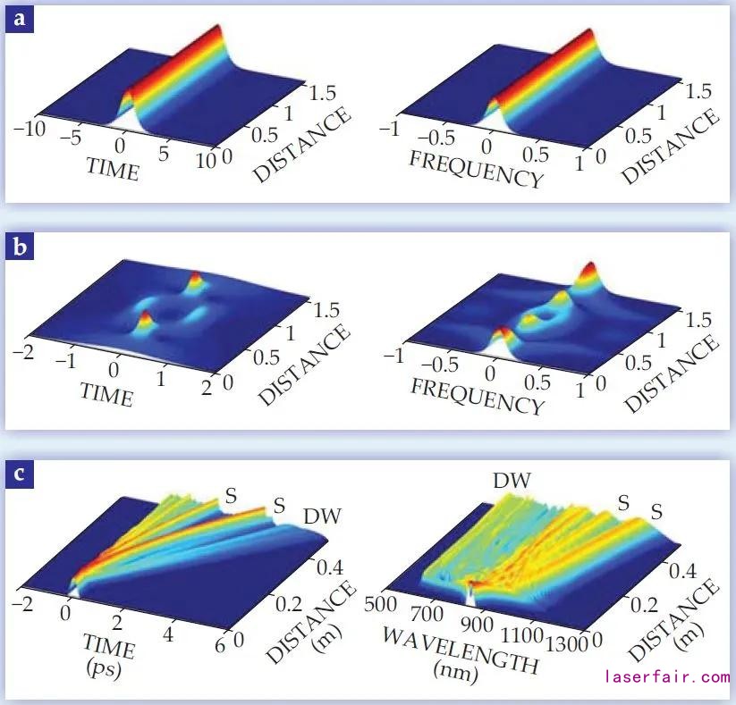 c. 在孤子分裂時,初始光脈沖分成一系列基態(tài)孤子(S)和色散波(DW)。兩種模擬中都包含破壞初始周期演變的的高階色散。單孤子分裂成多孤子,在傳播時,色散使孤子帶寬向高頻(短波長)展寬,非彈性散射使孤子帶寬向低頻(長波長)展寬。