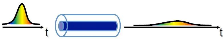 材料的線性光學(xué)性質(zhì)由折射率確定。寬帶光脈沖通過材料時具有不同的折射率,由于這種色散,脈沖中不同波長的光分量通過光纖的速度不同,其時間脈沖包絡(luò)被展寬,但是頻譜不變。