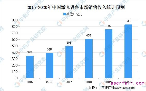2018年,中國激光設備市場保持平穩(wěn)增長的趨勢。工業(yè)、信息、商業(yè)、醫(yī)學及科研等領域的激光設備市場銷售額達605億元,同比增長22.22%,相較于2014年的260億元,年均復合增速達到23.51%。中商產(chǎn)業(yè)研究院預測,2020年我國激光設備銷售收入將達830億元。