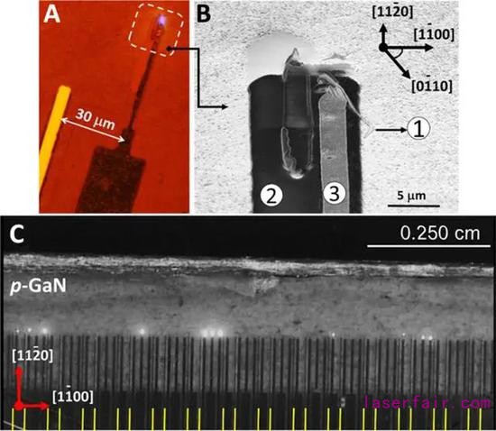 圖|在高電流密度下,鰭式 LED 過(guò)渡到鰭式激光器(來(lái)源:Science Advances)