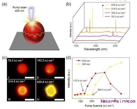 圖1 智能響應(yīng)的微激光器供、受激光隨泵浦能量的競爭(a)單個微球在400nm泵浦下的激光機(jī)制示意圖;(b)單個微球在不同泵浦能量下的光譜圖;(c)相對應(yīng)的不同泵浦能量下單個微球的實(shí)況圖;(d)單個微球在不同泵浦能量下激光能量示意圖。