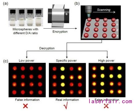 圖2 智能響應(yīng)的微型激光的光加密陣列(a)含有不同供、受體比例組合的微球作為有機(jī)打印的編碼打印原料;(b)激光矩陣的光加密陣列示意圖;(c)通過受激每個微球受激狀態(tài)破譯編碼信息。