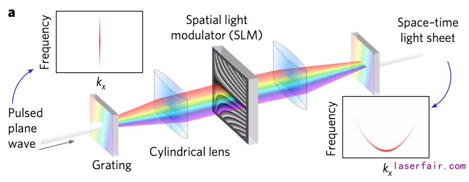 一束光的空間特性指它的空間外形(大小和形狀),時間特征則與脈沖的持續(xù)時間有關(guān)。所有的激光束都產(chǎn)生相互獨立的、不耦合的時間-空間特性,然而,作者聰明而有目的地將這兩者關(guān)聯(lián)起來(利用圖1的裝置:衍射光柵、空間光調(diào)制器),并研究了這樣做的結(jié)果和影響——這種新型的時空耦合波包光束具有普通光束無法獲得的獨特特性。