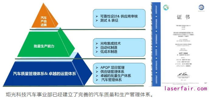 炬光科技力求成為激光光學行業(yè)中最懂汽車應用和體系,汽車行業(yè)中最懂光子技術(shù)的專家。目前,炬光科技擁有全球領先的微光學整形技術(shù)、激光陣列AuSn貼片封裝技術(shù)、光電集成設計與制造技術(shù),并已獲得IATF16949體系認證。