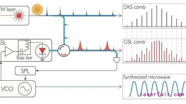 該方法將微諧振器頻率梳注入緊湊型激光器,該激光器的強(qiáng)度由現(xiàn)成的微波振蕩器進(jìn)行調(diào)制。通過迫使調(diào)制頻率緊緊跟隨微諧振器頻率梳產(chǎn)生的微波的次諧波頻率,研究小組成功地產(chǎn)生了新的微波,其頻率可以發(fā)生很大的變化。