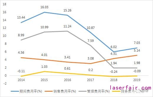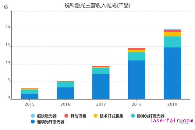 分產(chǎn)品來看,2019年脈沖光纖激光器實(shí)現(xiàn)營收同比增長44.02%至3.21億元,占比15.96%,毛利率減少17.05pp至15.73%;連續(xù)光纖激光器實(shí)現(xiàn)營收同比增長32.47%至14.77億元,占比73.50%,毛利率減少17.13pp至32.33%;超快激光器實(shí)現(xiàn)營收2446.52萬元,占比1.22%;技術(shù)開發(fā)服務(wù)實(shí)現(xiàn)營收同比增長51.21%至1.17億元,占比5.83%;其他實(shí)現(xiàn)營收7040.82萬元,占比3.50%。