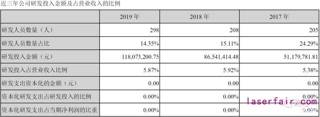 根據(jù)公司的總體發(fā)展戰(zhàn)略,公司的研發(fā)主要圍繞高功率光纖激光器及其關(guān)鍵器件等項(xiàng)目進(jìn)行。公司持續(xù)加大研發(fā)投入,為公司的持續(xù)發(fā)展提供強(qiáng)有力的技術(shù)支撐和產(chǎn)品支撐,并為公司未來的發(fā)展培育新的增長點(diǎn)。2019年度,公司研發(fā)費(fèi)用總額11,807.32萬元,占公司營業(yè)收入的比例為5.87%,占公司歸屬于上市公司所有者權(quán)益的比例為5.15%。