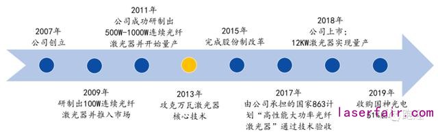 銳科激光成立于2007年;2009年研制出100W連續(xù)光纖激光器并推入市場;2011年公司成功研制出500W-1000W連續(xù)光纖激光器并開始量產(chǎn);2013年攻克萬瓦激光器核心技術(shù);2015年完成股份制改制;2018年上市,12KW激光器實(shí)現(xiàn)量產(chǎn);2019年收購國神光電51%股權(quán),正式步入超快激光器領(lǐng)域。
