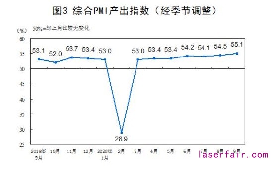 9月份,綜合PMI產(chǎn)出指數(shù)為55.1%,比上月上升0.6個(gè)百分點(diǎn),表明我國企業(yè)生產(chǎn)經(jīng)營活動(dòng)有所加快。