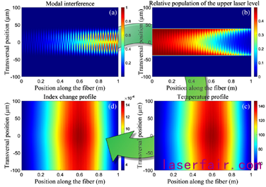當(dāng)光纖激光的輸出平均功率超過TMI閾值時(shí),光纖中不同橫模之間便會(huì)能量轉(zhuǎn)移,這種能量轉(zhuǎn)移需要相位匹配。長(zhǎng)周期光柵(LPG)是一種允許光纖中不同橫模間進(jìn)行能量交換的光學(xué)結(jié)構(gòu),其內(nèi)部折射率呈周期性(準(zhǔn)周期性)分布,周期明顯長(zhǎng)于激光波長(zhǎng)。為了滿足不同橫模間的能量轉(zhuǎn)移條件,LPG中折射率變化的周期性和對(duì)稱性必須與這些橫模所產(chǎn)生的模間干涉圖樣(MIP)相似。目前,廣泛接受的觀點(diǎn)認(rèn)為光纖中LPG的產(chǎn)生是熱積累導(dǎo)致的。熱致LPG成因借助上圖1解釋為:當(dāng)光耦合進(jìn)大纖芯光纖后,能量大部分流入基模,少部分流入第一高階模。不同橫模在光纖中相速度的差異導(dǎo)致了MIP的產(chǎn)生,使得纖芯中的光場(chǎng)呈現(xiàn)強(qiáng)弱交替的準(zhǔn)周期性分布。相對(duì)于弱的光場(chǎng),強(qiáng)光場(chǎng)區(qū)域的反轉(zhuǎn)粒子數(shù)耗盡更快,所以這種光場(chǎng)的準(zhǔn)周期性分布會(huì)使得反轉(zhuǎn)粒子數(shù)也呈現(xiàn)出橫向不均勻的準(zhǔn)周期性分布。反轉(zhuǎn)粒子數(shù)的變化會(huì)影響功率放大和能量提取能力,隨之便會(huì)產(chǎn)生橫向不均勻的準(zhǔn)周期性分布的溫度場(chǎng)。溫度分布的差異性會(huì)在熱光效應(yīng)的影響下生成準(zhǔn)周期性分布的折射率光柵,這就是光纖中熱致折射率光柵(RIG)的產(chǎn)生過程。