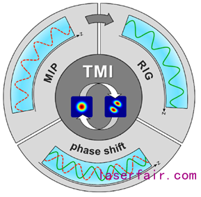 此外,能量要在不同橫模間轉(zhuǎn)移還需要在MIP和RIG之間存在一個(gè)相移,如圖2所示。目前,關(guān)于MIP與RIG間相移的成因仍然懸而未決。一種說法認(rèn)為不同橫模間中心頻率不同,因而產(chǎn)生不斷變化的MIP,MIP和RIG間的相移在低功率下就存在,但只有在高功率下才有明顯的能量轉(zhuǎn)移過程。這種說法中的中心頻率差異來源無法解釋,且與某些實(shí)驗(yàn)結(jié)果有矛盾。另一種說法認(rèn)為橫模間不存在中心頻率差異,產(chǎn)生的MIP是準(zhǔn)靜止的,模式間能量轉(zhuǎn)移對(duì)相移的靈敏度會(huì)隨著平均功率的增大而增大,呈指數(shù)上升趨勢(shì)。因?yàn)楫?dāng)平均功率增加時(shí)對(duì)應(yīng)的RIG也在增強(qiáng),在足夠強(qiáng)烈的RIG下,哪怕是系統(tǒng)的固有噪聲等產(chǎn)生的很小的相移也會(huì)導(dǎo)致強(qiáng)烈的能量轉(zhuǎn)移。雖然兩種說法都有相應(yīng)的模擬計(jì)算,但只有第二種說法得出的計(jì)算結(jié)果更符合實(shí)際,也包含了更多關(guān)于TMI背后的真實(shí)物理機(jī)制。