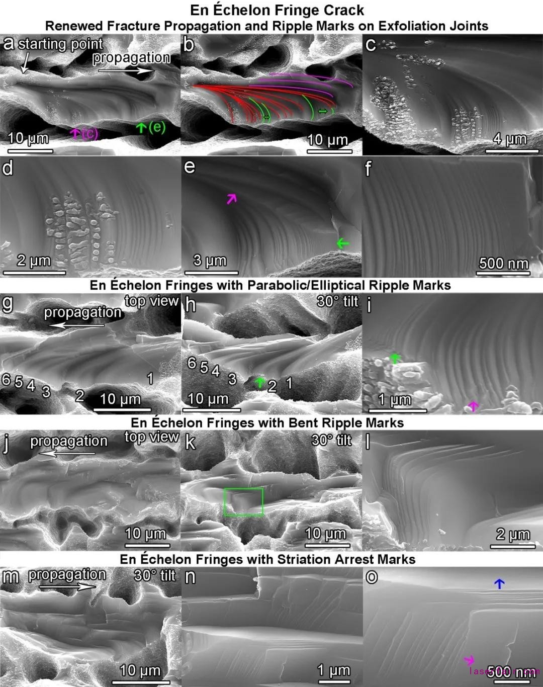 En échelon 微紋痕及納米拋物線狀紋痕 圖4展現(xiàn)了典型的en échelon微紋痕及其納米拋物線狀紋痕。碎裂起始于溝槽的一個(gè)角落(圖4a),然后沿著平行溝槽的方向傳輸。在碎裂傳輸?shù)倪^程中,裂紋的強(qiáng)度和方向會(huì)不斷變化,產(chǎn)生一系列en échelon微紋痕及其納米拋物線狀紋痕。碎裂紋痕可分為三種典型的結(jié)構(gòu),如圖4b三種不同顏色所表示。紅色標(biāo)識(shí)勾畫了一系列始于碎裂起始點(diǎn)(starting point)的en échelon微紋痕,在其間分布著大面積的納米拋物線狀紋痕(綠色標(biāo)識(shí)區(qū)域),如圖4d-f所示。粉色標(biāo)識(shí)表明縱向碎裂傳播會(huì)形成一系列拋物線型臺(tái)階狀結(jié)構(gòu),在圖4m更明顯。在每層臺(tái)階上,會(huì)分布著一系列不同取向的納米結(jié)構(gòu)(圖4n-o),表明碎裂可以在不同維度同時(shí)傳播。圖4g-h和圖4j-k顯示裂紋傾向于先向下傳輸然后再向頂端傳輸,形成多達(dá)6層深度逐步遞減的拋物線型微米臺(tái)階結(jié)構(gòu)(圖4h)和數(shù)層“弧形”納米紋痕(圖4l)。在高度非突變(高度突變?nèi)鐖D4n)的微米臺(tái)階結(jié)構(gòu)上會(huì)生成大面積納米拋物線狀紋痕(圖4h-i),表明大尺度碎裂傳播過程中伴隨著一系列納米尺度的碎裂波前震動(dòng)。圖4c-d表明許多納米紋痕演變成HSFLs或珍珠狀納米顆粒,此現(xiàn)象將在圖9詳細(xì)表征和分析。