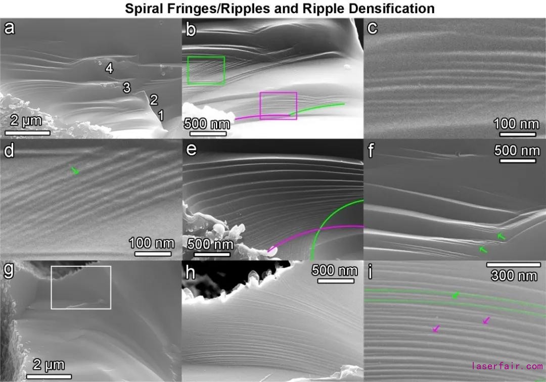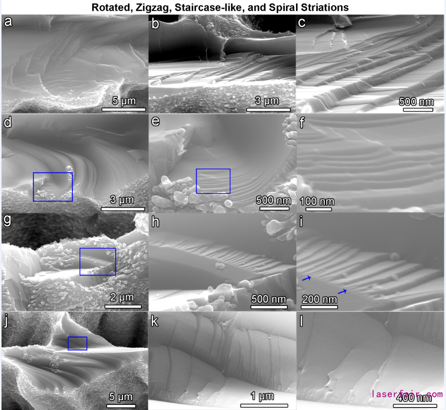 En échelon 微紋痕及納米拋物線狀紋痕 圖4展現(xiàn)了典型的en échelon微紋痕及其納米拋物線狀紋痕。碎裂起始于溝槽的一個角落(圖4a),然后沿著平行溝槽的方向傳輸。在碎裂傳輸?shù)倪^程中,裂紋的強(qiáng)度和方向會不斷變化,產(chǎn)生一系列en échelon微紋痕及其納米拋物線狀紋痕。碎裂紋痕可分為三種典型的結(jié)構(gòu),如圖4b三種不同顏色所表示。紅色標(biāo)識勾畫了一系列始于碎裂起始點(diǎn)(starting point)的en échelon微紋痕,在其間分布著大面積的納米拋物線狀紋痕(綠色標(biāo)識區(qū)域),如圖4d-f所示。粉色標(biāo)識表明縱向碎裂傳播會形成一系列拋物線型臺階狀結(jié)構(gòu),在圖4m更明顯。在每層臺階上,會分布著一系列不同取向的納米結(jié)構(gòu)(圖4n-o),表明碎裂可以在不同維度同時傳播。圖4g-h和圖4j-k顯示裂紋傾向于先向下傳輸然后再向頂端傳輸,形成多達(dá)6層深度逐步遞減的拋物線型微米臺階結(jié)構(gòu)(圖4h)和數(shù)層“弧形”納米紋痕(圖4l)。在高度非突變(高度突變?nèi)鐖D4n)的微米臺階結(jié)構(gòu)上會生成大面積納米拋物線狀紋痕(圖4h-i),表明大尺度碎裂傳播過程中伴隨著一系列納米尺度的碎裂波前震動。圖4c-d表明許多納米紋痕演變成HSFLs或珍珠狀納米顆粒,此現(xiàn)象將在圖9詳細(xì)表征和分析。