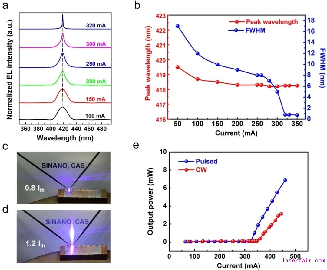 ??圖4. 硅基GaN翻轉(zhuǎn)脊形波導(dǎo)激光器(脊形尺寸:10×800 μm2)的(a)不同注入電流下的電致發(fā)光光譜,(b)電致發(fā)光光譜峰值波長與半高寬隨注入電流的變化曲線,(c) 0.8倍和(d) 1.2倍閾值電流下的遠(yuǎn)場光斑,(e)輸出功率-電流曲線。