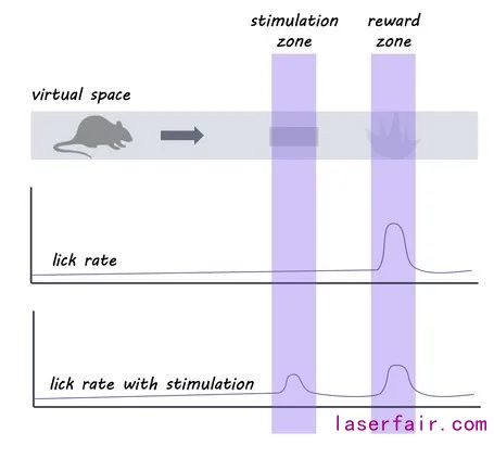 這基本上把虛擬目標(biāo)區(qū)的活動(dòng)GPS神經(jīng)元與甜蜜記憶聯(lián)系在一起。如果GPS細(xì)胞負(fù)責(zé)將記憶固定在大腦中,那么不管鼠標(biāo)在虛擬空間的實(shí)際位置在哪里,人工激活這些細(xì)胞都應(yīng)該重新激活記憶,并使其在預(yù)期中舔傳感器。