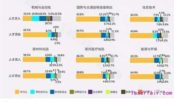 相對比其他類制造業(yè)來講,機械與自動化行業(yè)在吸引各界跨界人士方面有著很大的優(yōu)勢,剩余的其余5個行業(yè),他們的相互流入流出在數(shù)據(jù)上看是達到了相對的平衡。