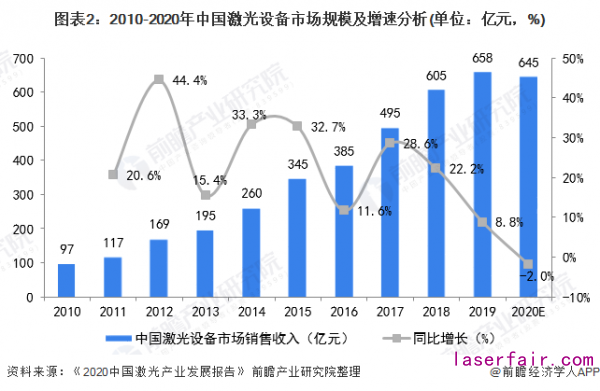 根據(jù)2020年3月27日,中國科學院武漢文獻情報中心牽頭編寫的《2020中國激光產(chǎn)業(yè)發(fā)展報告》發(fā)布的數(shù)據(jù)顯示,2010-2019年我國激光設(shè)備市場規(guī)模呈現(xiàn)逐年增長增長態(tài)勢。其中,2019年我國激光設(shè)備市場實現(xiàn)銷售收入達658億元,同比增長8.8%,增速有所放緩。值得注意的是,受到2020年冠肺炎疫情的影響,全球經(jīng)濟走勢不明朗,《2020中國激光產(chǎn)業(yè)發(fā)展報告》預計2020年中國激光設(shè)備市場整體銷售收入將會出現(xiàn)10年來首次負增長,約為645億元。
