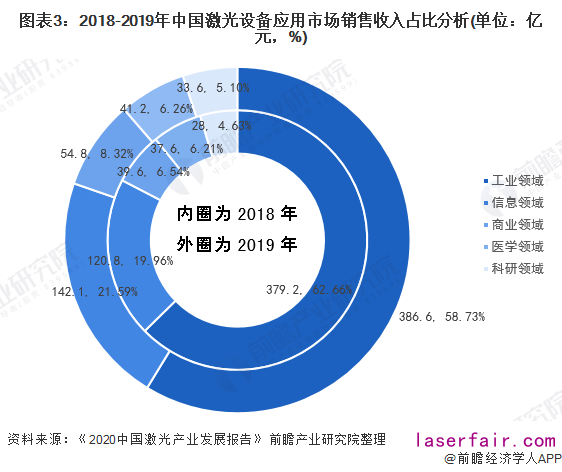 我國激光設(shè)備主要應(yīng)用在工業(yè)、信息、商業(yè)、醫(yī)學以及科研領(lǐng)域。根據(jù)《2020中國激光產(chǎn)業(yè)發(fā)展報告》的數(shù)據(jù)顯示,2019年工業(yè)領(lǐng)域激光設(shè)備銷售收入達到386.6億元,占總收入的58.73%,仍居于首位;其次是信息領(lǐng)域激光設(shè)備,實現(xiàn)銷售收入為142.1億元;而激光設(shè)備在醫(yī)學領(lǐng)域的市場份額僅為6.26%,實現(xiàn)銷售收入41.2億元。