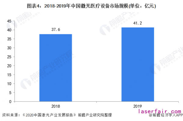 前瞻結(jié)合醫(yī)學領(lǐng)域激光設(shè)備銷售收入占比以及激光設(shè)備市場規(guī)模來看,2018-2019年我國激光醫(yī)療設(shè)備市場規(guī)模呈現(xiàn)增長趨勢,2019年我國激光醫(yī)療設(shè)備的市場規(guī)模為41.2億元。