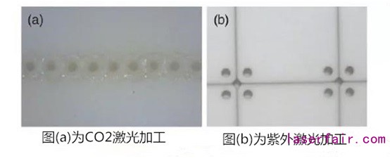 根據(jù)陶瓷對激光的吸收屬性,以及電子陶瓷元器件的逐漸小型化,CO2激光、綠光加工陶瓷都難以達到要求,只有紫外激光能實現(xiàn)陶瓷精細加工,包括陶瓷的標(biāo)刻、切割、打孔。CO2激光與紫外激光在陶瓷材料加工實際效果對比: