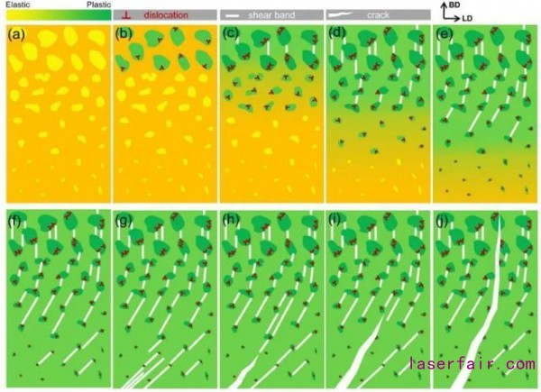 由于沒有晶體缺陷,諸如位錯,晶界等,塊體金屬玻璃(bulk metallic glasses (BMGs))呈現出高強度和彈性配以塑性加工性。塊體金屬玻璃的廣泛大量的應用卻受到了在室溫下塑性差的限制,尤其是在拉緊應力的條件下。對于區(qū)域應力,塑性應變也高度的本地化為主要的剪切帶,該剪切帶快速的擴展和導致了塊體金屬玻璃的嚴重損壞。為了克服這一限制,二次相也經常通過原位的引入堅硬的塊體金屬玻璃基材中,并形成一種稱之為塊體金屬玻璃基材復合材料。這些分散的軟的枝晶促進多個剪切帶的成核,阻礙了剪切帶的快速發(fā)展進入到裂紋,并且相應地提高其韌性。