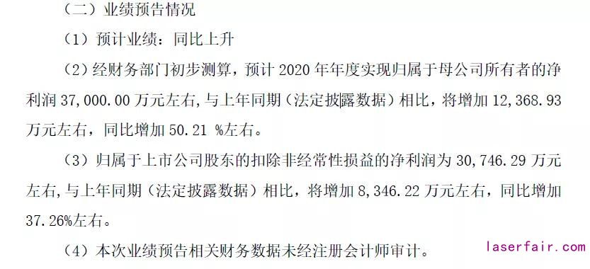 近日,上海柏楚電子科技股份有限公司(以下簡稱“柏楚電子”)發(fā)布2020年年度業(yè)績預(yù)增公告稱,預(yù)計(jì)2020年實(shí)現(xiàn)歸屬于母公司所有者的凈利潤3.7億元左右,同比增加50.21 %左右;歸屬于上市公司股東的扣除非經(jīng)常性損益的凈利潤為3億元左右,同比增加37.26%左右。