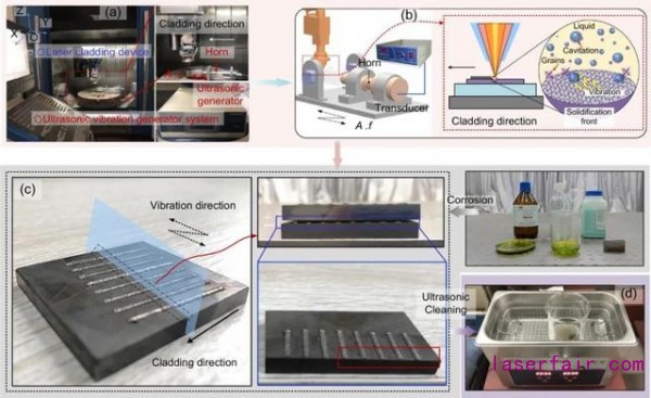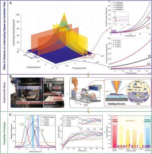 激光熔覆在金屬部件成形和制備涂層以及修復(fù)等方面具有非常明顯的優(yōu)勢。然而,隨之而來的是,其顯微組織中的內(nèi)部缺陷和機械性能較差等問題,尚需要進一步的開展研究。在這里,來自沈陽東北大學(xué)的研究人員,采用超聲波輔助加工的辦法進行激光熔覆來提高熔覆部件的性能。基于超聲波的聲化和空化效應(yīng)對金屬凝固過程中所起的作用,振動參數(shù)對熔池金屬的過冷度和孕育速率進行了研究。