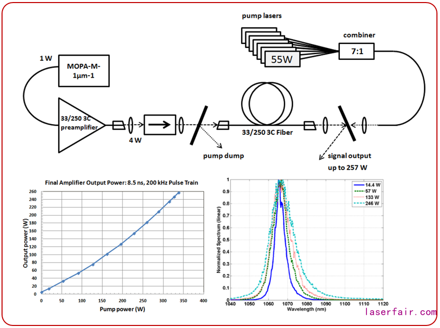 2012年,Michigan大學(xué)超快光學(xué)研究中心Thomas Sosnowski等人[12]通過33/250um 3C光纖實現(xiàn)了257W,200kHz,8.5ns,1.2mJ脈沖;86.5uJ,575kW峰值功率脈沖,以及利用55um 3C光纖實現(xiàn)了41W,8.3mJ,640kW的高能量脈沖輸出。