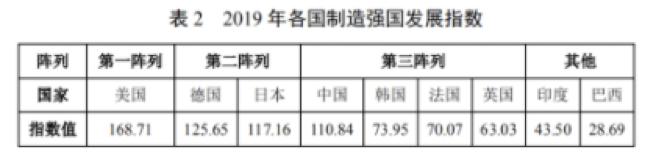 去年12月發(fā)布的《2020中國制造強國發(fā)展指數(shù)報告》里面(見表2),在被跟蹤測評的世界9個主要國家中,美國以168.71分處于第一陣列,綜合優(yōu)勢突出;德國、日本分別以125.65、117.16分穩(wěn)居第二陣列,相對優(yōu)勢明顯;中國(110.84)、韓國(73.95)、法國(70.07)、英國(63.03)處于第三陣列;印度(43.50)、巴西(28.69)排名第八和第九。中國和第二陣列中日本的差距已經(jīng)不太遠。