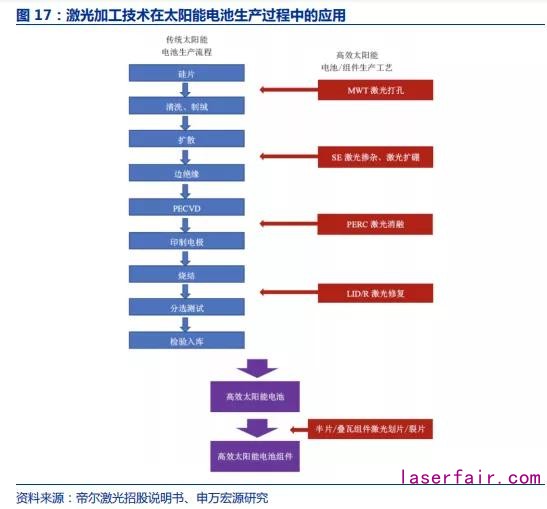 電價下降趨勢壓力下,高效太陽能電池產(chǎn)品的使用為激光加工設(shè)備帶來發(fā)展機(jī)遇。光伏行業(yè)發(fā)展迅速帶來機(jī)遇,但同時競價上網(wǎng)政策加大了企業(yè)競爭壓力。因此,光伏發(fā)電企業(yè)紛紛通過使用更加高效的電池組件來降低發(fā)電成本,PERC、SE、MWT 電池等工藝技術(shù)能夠顯著提升電池發(fā)電效率、為光伏電站及電池廠商帶來可觀收益,應(yīng)用得到推廣。而在電池及組件的生產(chǎn)過程中,激光消融(刻蝕)、激光摻雜、激光打孔及激光劃片/裂片工藝,具備工藝流程簡單、投入成本低、制作效率高等多重優(yōu)勢,有效控制了生產(chǎn)過程中的光學(xué)損失和電學(xué)損失,對于太陽能電池光電轉(zhuǎn)換效率提升具有重要作用。