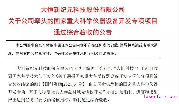 近日,大恒新紀(jì)元科技股份有限公司(以下簡稱“大恒科技”)發(fā)布公告稱,由該公司牽頭承擔(dān)的國家重大科學(xué)儀器開發(fā)專項“基于飛秒激光的太赫茲時域光譜儀開發(fā)”項目進展順利,進度和成果產(chǎn)出達到任務(wù)書要求的考核指標(biāo),順利通過綜合驗收。