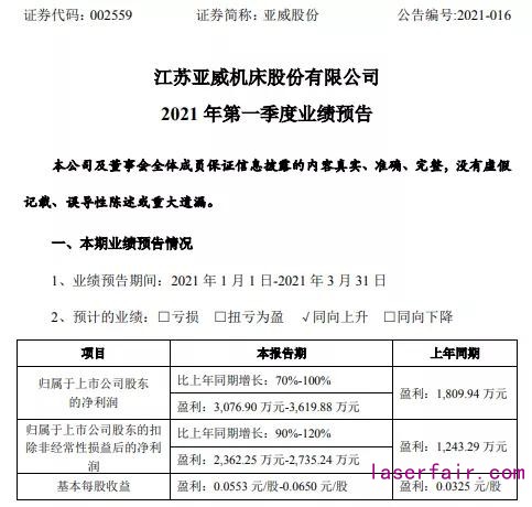 報(bào)告期內(nèi),江蘇激光聯(lián)盟單位亞威股份業(yè)務(wù)繼續(xù)呈現(xiàn)加速成長的良好態(tài)勢,鞏固提升了在國內(nèi)金屬成形機(jī)床行業(yè)細(xì)分領(lǐng)域的龍頭地位。一季度新簽有效合同同比增長61%,環(huán)比2020年四季度增長17%,其中數(shù)控折彎機(jī)、數(shù)控轉(zhuǎn)塔沖床等成形機(jī)床設(shè)備訂單皆實(shí)現(xiàn)了翻倍增長,激光加工設(shè)備訂單實(shí)現(xiàn)了近80%增長。同時(shí)公司持續(xù)加快智能升級(jí)步伐,加大技術(shù)創(chuàng)新力度,優(yōu)化內(nèi)部產(chǎn)能效率,經(jīng)營業(yè)績穩(wěn)步提升。