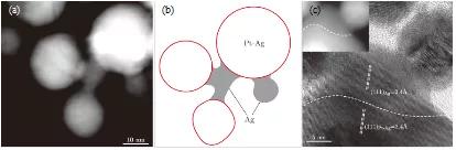 圖4 (a) 飛秒激光輻照下Pt和Ag納米顆粒的互連; (b) 連接界面示意圖; (c) 界面取向