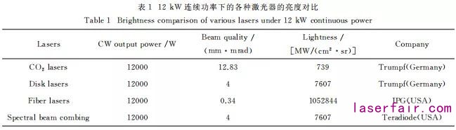 表1為12kW 連續(xù)輸出功率下,基于光譜合束的半導體激光器與其他商用激光器的亮度對比,可以看出,半導 體 激 光 器 超 過 了 CO2激光 器、達 到 了Disk 激 光 器 的 水 平。同 時 光 譜 合 束 也 將 芯 徑100μm光纖耦合 半 導 體 激 光 源 的 功 率 提 升 到 萬 瓦量級,相對于常規(guī)合束技術(shù),其功率和亮度提升了近2個數(shù)量級。