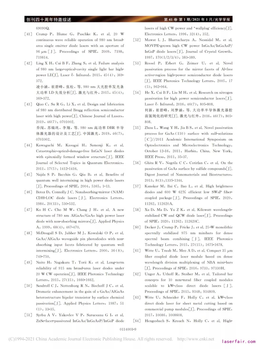 1987年,貝爾 通 訊 研 究 公 司 的 Sandroff等[50] 發(fā)明了腔面硫 化 處 理 技 術(shù)。采 用 Na2S·9H2O 溶 液將 GaAs/AlGaAs異質(zhì) 結(jié) 雙 極 晶 體 管(HBTs)腔 面鈍化,經(jīng)硫化處理后的 HBT 電流增 益 提 高 了60 多倍。1996年,Syrbu等[51]在蒸 鍍 高 反/增 透 膜 前利用原位生長 ZnSe技術(shù),將980nmInGaAs半導體激光 器 腔 面 鈍 化,使 激 光 器 連 續(xù) 輸 出 功 率 提 高50% 。1997年,美國威斯康星大學的 Mawst等[52] 利用激光輔助化學氣相沉積法在InGaAs雙量子阱半導體 激 光 器 腔 面 處 形 成 ZnSe 鈍 化 層,將 器 件COD 閾 值 提 高 了 50%。2005 年,德 國 的 Ressel等[53]報道了腔 面 鈍 化 無 鋁 有 源 區(qū) 大 功 率 半 導 體 激光器,在激光器的老化過程中表現(xiàn)出優(yōu)異的性能。2016 年,北 京 工 業(yè) 大 學 利 用 離 子 銑 氮 鈍 化 處 理980nm半導體激光器腔面,得到了 CW 輸出功率為22.5 W,器 件 輸 出 功 率 提 高 了 32.14%[54]。2019年,中國科學院半導體研究所采用射頻等離子體增強反應磁控濺射沉積α-SiNx薄膜對980nm光子晶體激光器進 行 腔 面 鈍 化。通 過 優(yōu) 化 氮-氬混 合 等 離子體并采用 快 速 退 火 的 方 法,顯 著 抑 制 了 COMD, 提高了器 件 的 性 能 和 激 光 系 統(tǒng) 的 穩(wěn) 定 性[55]。2019年,中國科學院半導體所在真空中直接蒸鍍一層厚度為25nm 的ZnSe材料作為鈍化膜,利用 ZnSe薄 膜材料大禁帶寬度的特性作為半導體激光器腔面鈍化膜,有效提高半導體激光器輸出功率和器件損傷閾值,提供腔面保護[56]。