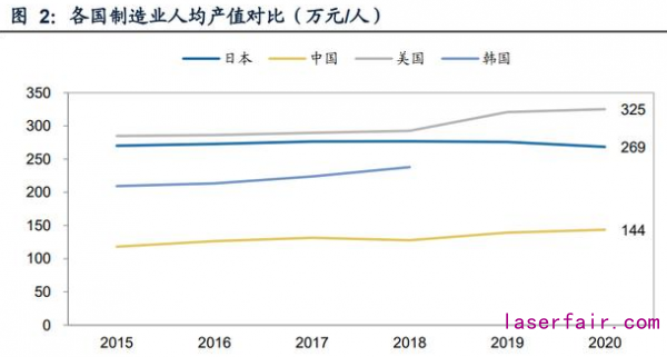 制造業(yè)復(fù)蘇浪潮下,我國激光行業(yè)發(fā)展前景良好。當(dāng)前我國制造業(yè)生產(chǎn)效率與制造 強(qiáng)國差距還較大。從人均產(chǎn)值看2020年我國制造業(yè)人均 產(chǎn)值為144萬元/人,同期美國和韓國分別為325、269萬元。疊加人口紅利消失、勞 動力成本抬高的剪刀差效應(yīng),這一輪制造業(yè)上行周期將著力解決效率不足的問題, 核心邏輯是用機(jī)器替代人力,提高機(jī)器使用率和自動化程度。我國先進(jìn)制造業(yè)將實(shí) 現(xiàn)加速發(fā)展,激光行業(yè)潛在的替代空間廣闊。