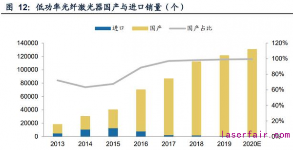 低功率光纖激光器基本實(shí)現(xiàn)國產(chǎn)替代,競爭轉(zhuǎn)向中高功率產(chǎn)品段。光纖激光器按照 激光燈工作模式,主要分為脈沖光纖激光器和連續(xù)光纖激光器,按輸出激光功率大 小可分為低、中、高三檔。在低功率光纖激光器上,近年來國產(chǎn)品牌出貨迅猛,出 貨量從2013年的1.3萬臺上升至2019年的12萬臺,CAGR超過45%。市占率在2019 年達(dá)到99%,基本完成國產(chǎn)替代。