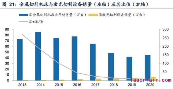 根據(jù)我們的測算結(jié)果,在薄板切割領(lǐng)域,中低功率激光切割機(jī)已基本完成對傳統(tǒng)機(jī) 床的替代。薄板切削機(jī)床與中低功率激光切割機(jī)的比值從2013年的39.76下降至 2020年的0.64。目前,中低功率激光切割機(jī)銷量已實(shí)現(xiàn)反超,薄板切割工作基本上 均已采用激光加工工藝。