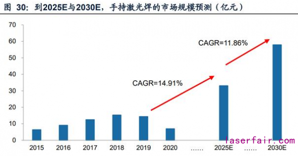 從測算結(jié)果看,到2025年,手持激光焊的市場規(guī)??梢赃_(dá)到33.06億元,2030年達(dá) 到57.91億元。2019至2025年,市場規(guī)模復(fù)合增速為14.91%;2025-2030年,增速 為11.86%。目前,手持激光焊所使用的激光器多在1-3kW,這一市場的增長將為中 低功率激光器創(chuàng)造可觀的下游需求,銳科激光等國內(nèi)激光器企業(yè)可以在這一領(lǐng)域?qū)?現(xiàn)收入的快速提升。