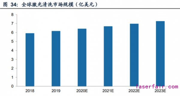 提高效率與性價(jià)比是開拓激光清洗藍(lán)海市場的關(guān)鍵。據(jù)國際咨詢機(jī)構(gòu)Markets and markets數(shù)據(jù),2019年,全球工業(yè)清洗市場規(guī)模為468億美元。就激光清洗這一分支, Reportlinker數(shù)據(jù)顯示,2019年全球激光清洗市場規(guī)模為6.14億美元,到2023年這 一數(shù)值預(yù)計(jì)將達(dá)到7.24億美元。雖然激光清洗設(shè)備擁有市場規(guī)模不斷上升的前景, 但其當(dāng)前滲透率還極低,僅為1.31%。影響激光清洗普及的因素除了功率外,還有 設(shè)備的性價(jià)比。激光器的降價(jià)、激光清洗技術(shù)的日趨成熟,以及環(huán)保政策的鼓勵(lì)推 進(jìn),為激光清洗突破當(dāng)前技術(shù)與成本的局限創(chuàng)造了可能。