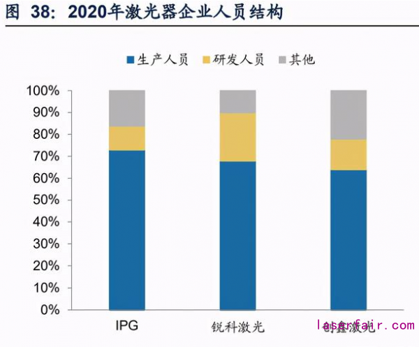 國內(nèi)企業(yè)在勞動力成本和售后服務(wù)上更具優(yōu)勢。目前激光器的生產(chǎn)由于工藝復(fù)雜、步驟繁瑣,仍然主要依賴技術(shù)工人的組裝,因此激光器行業(yè)具有勞動密集型屬性。 2020年IPG所有員工中制造人員占比達(dá)到75%,且主要來自于美國、俄羅斯、德國 等勞動力成本較高的地區(qū),相比國內(nèi)企業(yè)而言在勞動力成本方面具有一定劣勢。國 內(nèi)企業(yè)售后體系完善,響應(yīng)速度快。銳科基本形成了覆蓋全國,輻射全球的服務(wù)體 系,并提出“8小時(shí)內(nèi)提出解決方案,48小時(shí)內(nèi)工程師現(xiàn)場維修”的承諾。