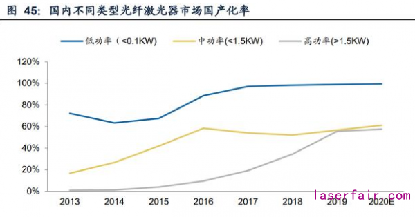 在中高功率光纖激光器上,技術(shù)不斷成熟推動國產(chǎn)率提升。2013-2019年中功率光 纖激光器市場出貨量保持15%以上增長,國產(chǎn)市占率持續(xù)提升,2019年達(dá)到56.7%。 2019年高功率產(chǎn)品國產(chǎn)出貨量近4000臺,國產(chǎn)化率達(dá)到56%,主要得益于國內(nèi)以銳 科和創(chuàng)鑫為代表的廠商在3-6KW功率產(chǎn)品上的技術(shù)成熟與產(chǎn)能提升。