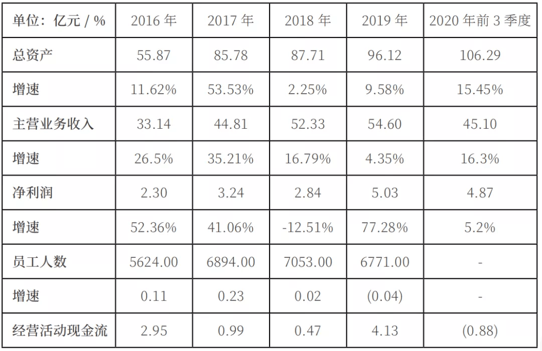 由表 3 可以發(fā)現(xiàn),公司近幾年業(yè)績(jī)快速發(fā)展,2016-2019 年主營(yíng)業(yè)務(wù)收入年均復(fù)合增速為18%,2019 年疫情對(duì)該行業(yè)形成強(qiáng)大沖擊,但公司業(yè)績(jī)依然保持了 4.35% 的增速,2020 年三季度又實(shí)現(xiàn)快速反彈,足以說(shuō)明公司業(yè)績(jī)發(fā)展強(qiáng)勁。同時(shí)可以發(fā)現(xiàn) 2019 年凈利潤(rùn)反而大幅提升,公司成本控制能力較強(qiáng)。公司在規(guī)模上整體保持比較快速的發(fā)展,2016-2019 年年均復(fù)合增速為20%,員工人數(shù)目前比較穩(wěn)定。