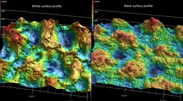 圖2.顯示了醫(yī)用級不銹鋼(a)上的白色和黑色標(biāo)記的表面輪廓,以及不銹鋼(b)上的各種飛秒激光標(biāo)記。