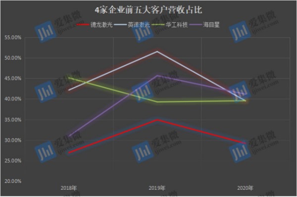 分析發(fā)現(xiàn),德龍激光客戶雖然眾多,但業(yè)務(wù)分散。2018年-2020年,德龍激光來自前五大客戶的營收占比分別為26.94%、34.93%、29.19%;其中,2020年,占比最高的群創(chuàng)光電,帶來的營收僅占德龍激光該年營收的7.62%(3193.07萬元)。而可比上市公司中,英諾激光、華工科技、海目星等企業(yè)來自前五大客戶的營收比重均高于德龍激光,詳情如下:
