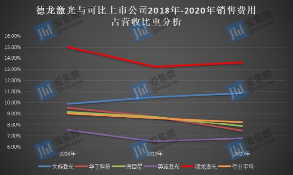 經(jīng)統(tǒng)計,德龍激光2018年-2020年銷售費用占營收比重分別為15%(4839萬元)、13.22%(4664萬元)、13.6%(5699萬元),遠(yuǎn)高于可比上市公司對應(yīng)統(tǒng)計周期的9.01%、8.6%、8.23%平均銷售費用占比;其中英諾激光對應(yīng)報告周期內(nèi)的銷售費用占比分別為7.52%、6.49%、6.79%,僅為德龍激光的一半。具體比較見下圖: