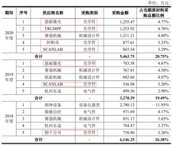 德龍激光IPO招股說明書透露,其前五大供應(yīng)商中,光學(xué)件供應(yīng)商數(shù)量在逐年增長,2018年僅相干公司一家光學(xué)件公司進(jìn)入其前五大供應(yīng)商;而到2020年,前五大供應(yīng)商中,有4家企業(yè)為光學(xué)件公司。需要特別注意的是,2018年-2020年,進(jìn)入其前五大供應(yīng)商的光學(xué)件公司,均是美國的恩耐激光、阿帕奇、相干公司,德國的通快集團(tuán)、SCANLAB等歐美公司。